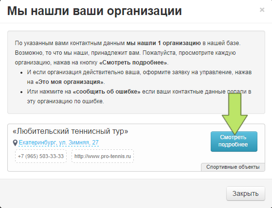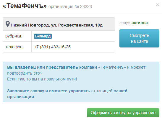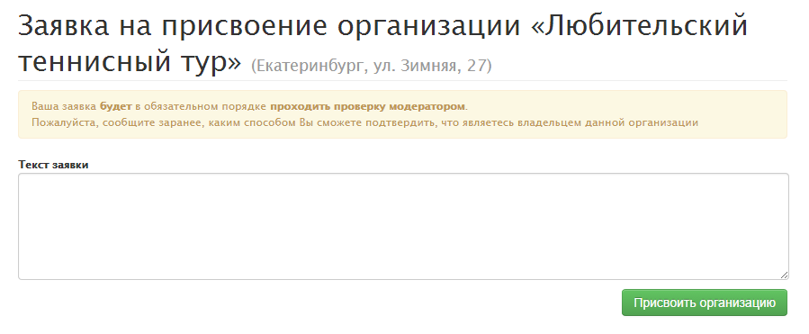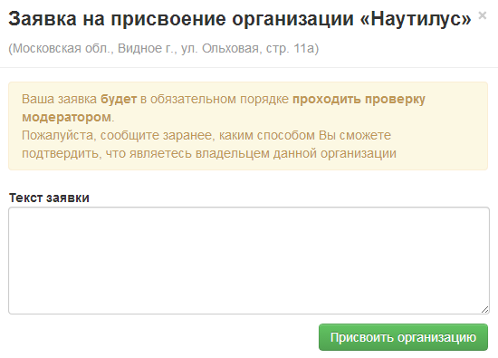 Наша система умеет выявлять случаи, когда пользователь добавляет на портал организацию, ранее размещенную администратором. В таком случае Вам, как владельцу, выгоднее присвоить организацию, чем добавлять новую. Так как существующая страница уже знакома поисковым системам и пользователям и обладает некоторым потоком переходов, мы рекомендуем использовать возможность присвоения к управлению ранее размещенной администратором организации, чтобы не потерять и с легкостью увеличивать количество посетителей вашей страницы